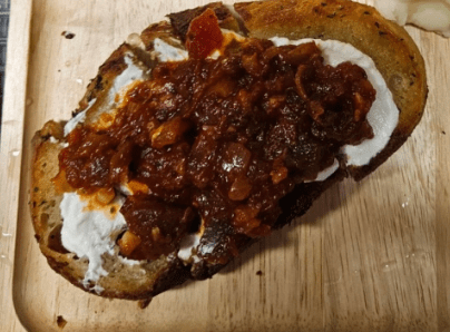 6) On top of the bread with the Greek yogurt added, add the tomato sauce that you made in steps 2~4